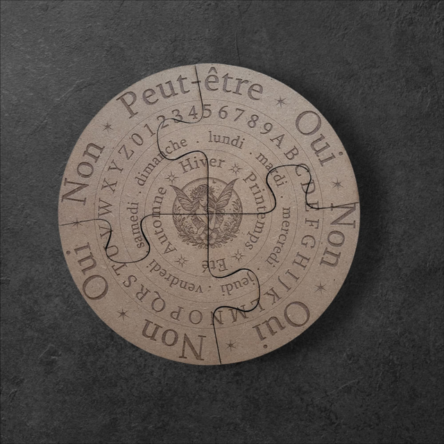 -1 planche de radiesthésie divinatoire en bois en puzzle de 16cm de diamètre pour faciliter le rangement dans la boite.